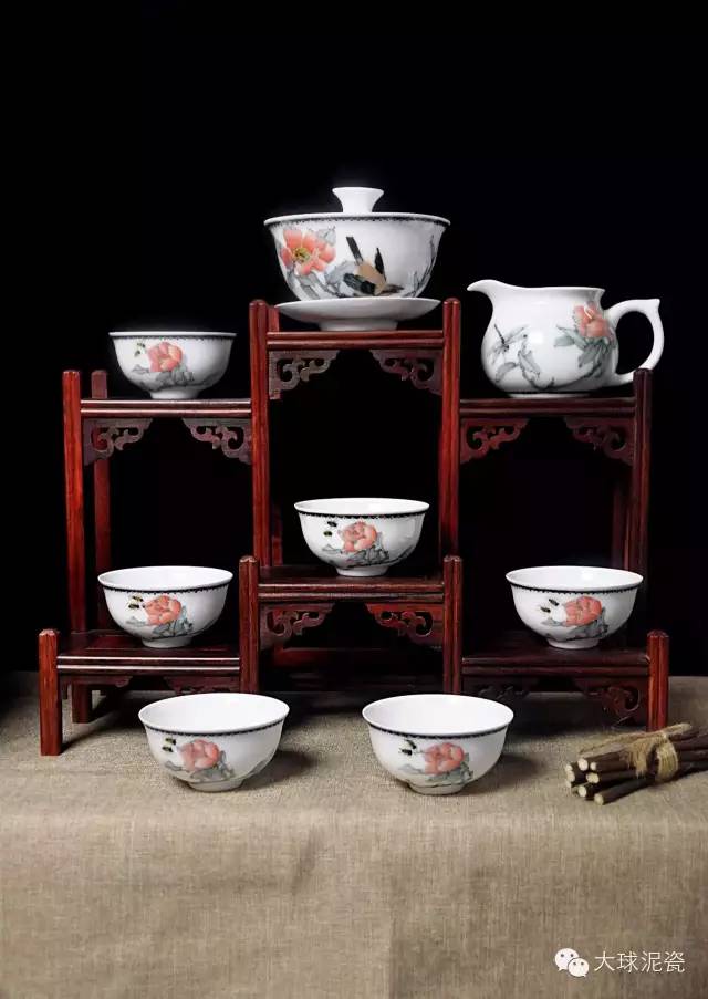 泡茶是一门艺术,茶具也颇讲究。一盏鲜醇清香的茶水配上雅致精美的大球泥瓷茶具,更能增添饮茶的情趣。大球泥瓷《清香》茶具由省级工艺美术大师邓剑波老师创作,剔透晶莹的瓷质与芳香淡雅的花朵心心相映,怡然成趣。再加上蜜蜂与雀鸟的生动点缀,使人赏心悦目,像是走进了一番春色盎然的场景。《清香》茶具,落笔简洁,却偏有不动声色之奢华;用色纯净,却偏有一种散落空灵的凝重感。