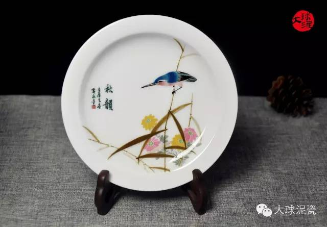 《四季》挂盘之《秋韵》作品,展现了烟波浩然的洞庭湖,一番秋色之景。而一只小巧玲珑、色彩艳丽的翠鸟停靠在水边的芦苇杆上,打破了这清晨的宁静与尴尬。工艺美术大师通过这一主题表达了自己对深秋的看法,希望突破传统绘画技法的束缚,能够有新的想象力与创新。在工艺美术大师的眼中,深秋的美不是萧条的、逊色的,而是别有一番耐人寻味的体验。这种美,却只留给善于发现与挖掘的有心之人。