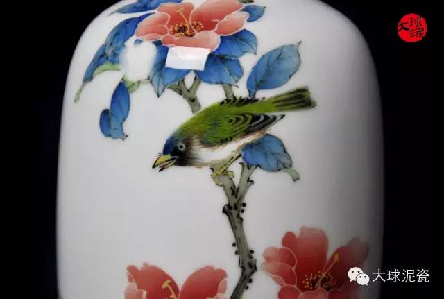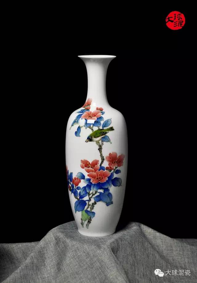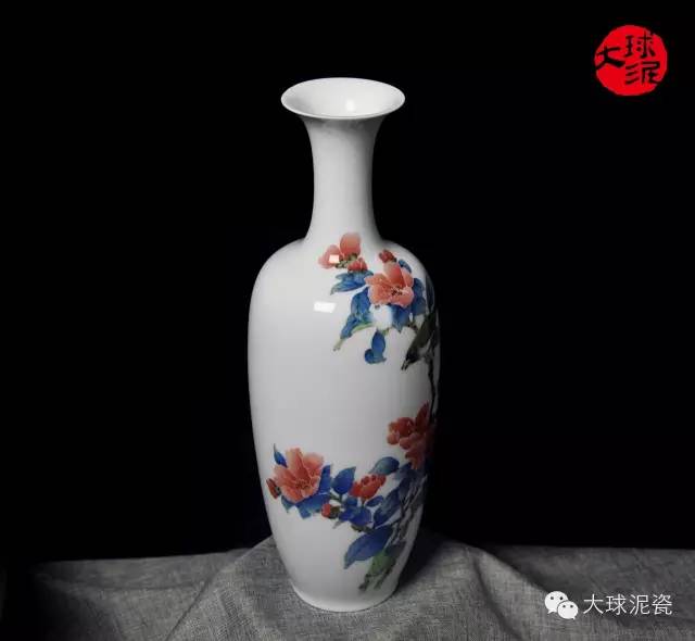 《鸟语花香》柳叶瓶,以大球泥为原材料,由工艺美术大师李璜香创作。釉色光亮纯净,洁白泛青,画面典雅清新,极具中国传统手绘之神韵。此件大球泥瓷,采用国画中常见的花鸟题材进行创作,画面布局疏密有致,有动有静,笔墨韵味更胜于纸质画作,体现出作者深厚的绘瓷功底。