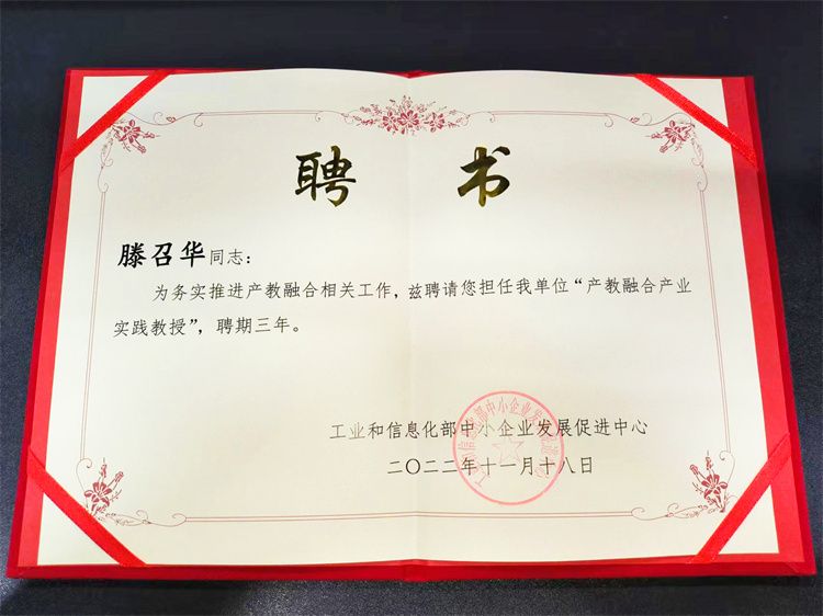 近期,由工业和信息化部中小企业发展促进中心选聘的“产教融合产业实践教授(第一批)入库人员”名单正式公布,公司董事长滕召华获聘教授,这是新年收到了第一个证书。